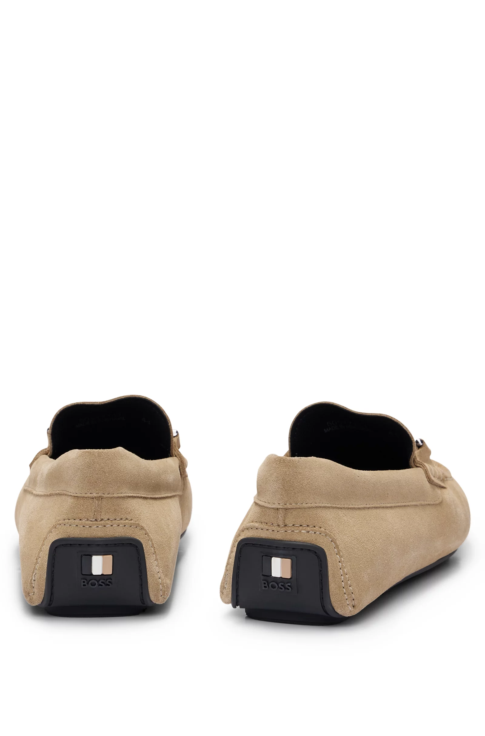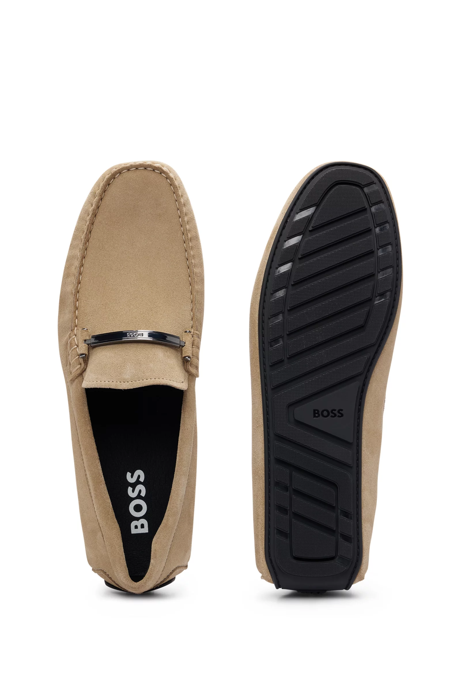 Unos mocasines BOSS elegantes, confeccionados en ante suave con herraje de la marca en el empeine.