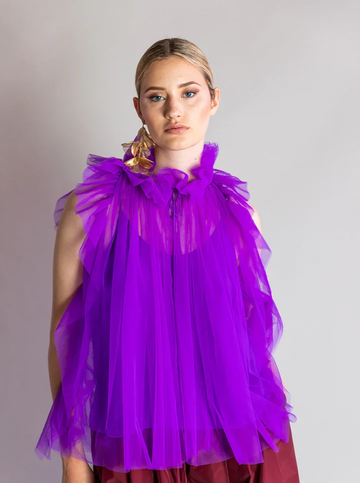 Presenta detalles de volantes que añaden un encanto delicado y sofisticado al diseño. Sin mangas y con un cuello ruffle, este top ofrece una silueta femenina y moderna.Confeccionado en tul de alta calidad, este top es ligero y suave al tacto, brindando comodidad durante todo el día.