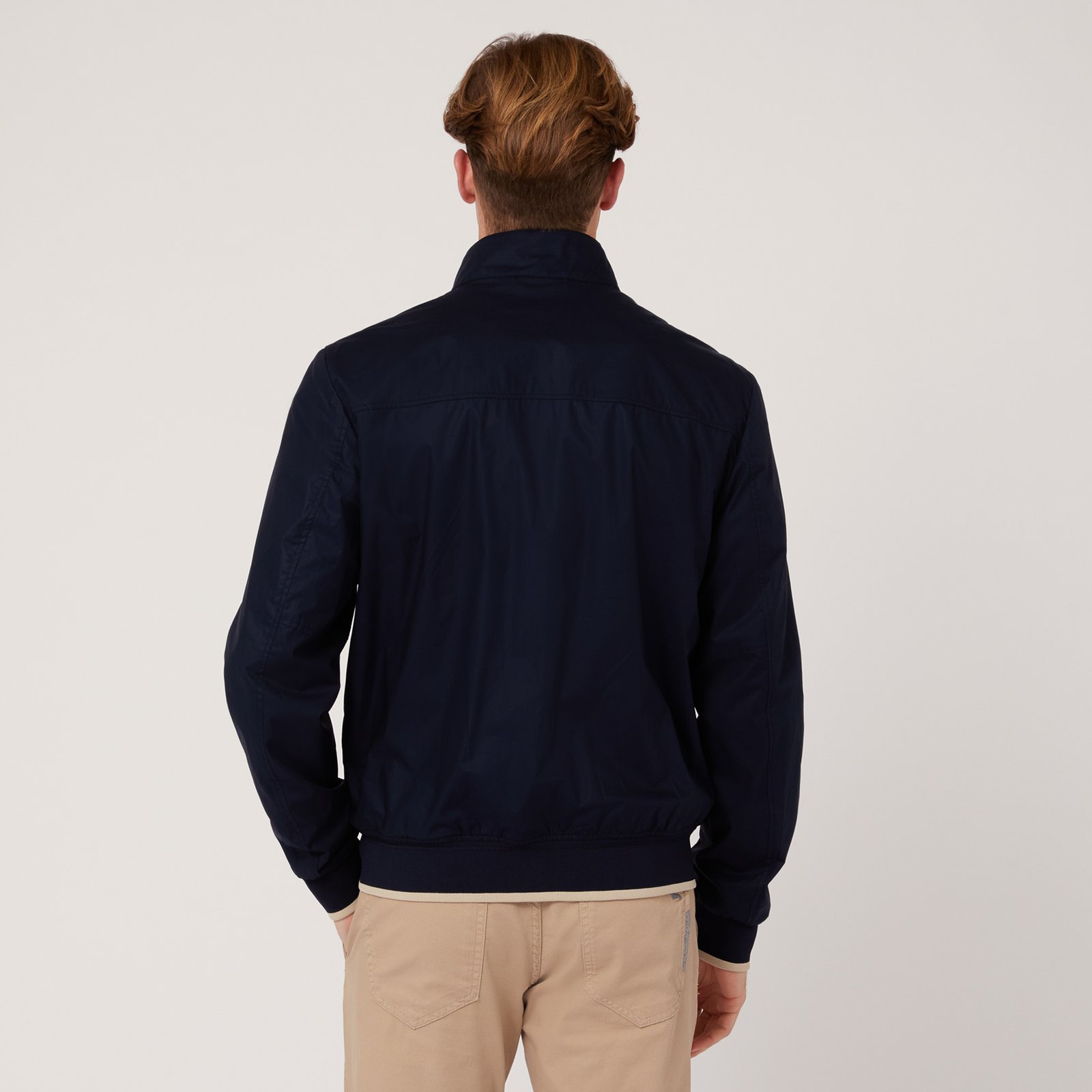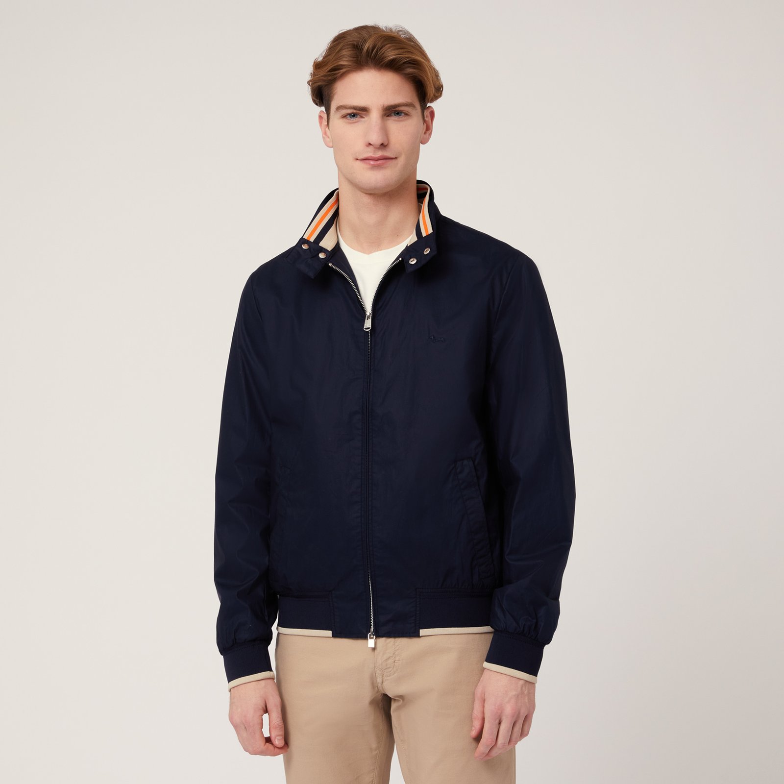 Bómber de algodón para hombre con una textura especial efecto papel perfecta para llevar en los días más frescos de entretiempo. Este modelo se centra en la funcionalidad con una cremallera delantera, prácticos bolsillos delanteros y un cuello con botones automáticos. El bajo y los puños de canalé elástico con borde a contraste, junto con el detalle de rayas en el interior del cuello y el icónico teckel bordado en el pecho, son los detalles que embellecen el diseño.