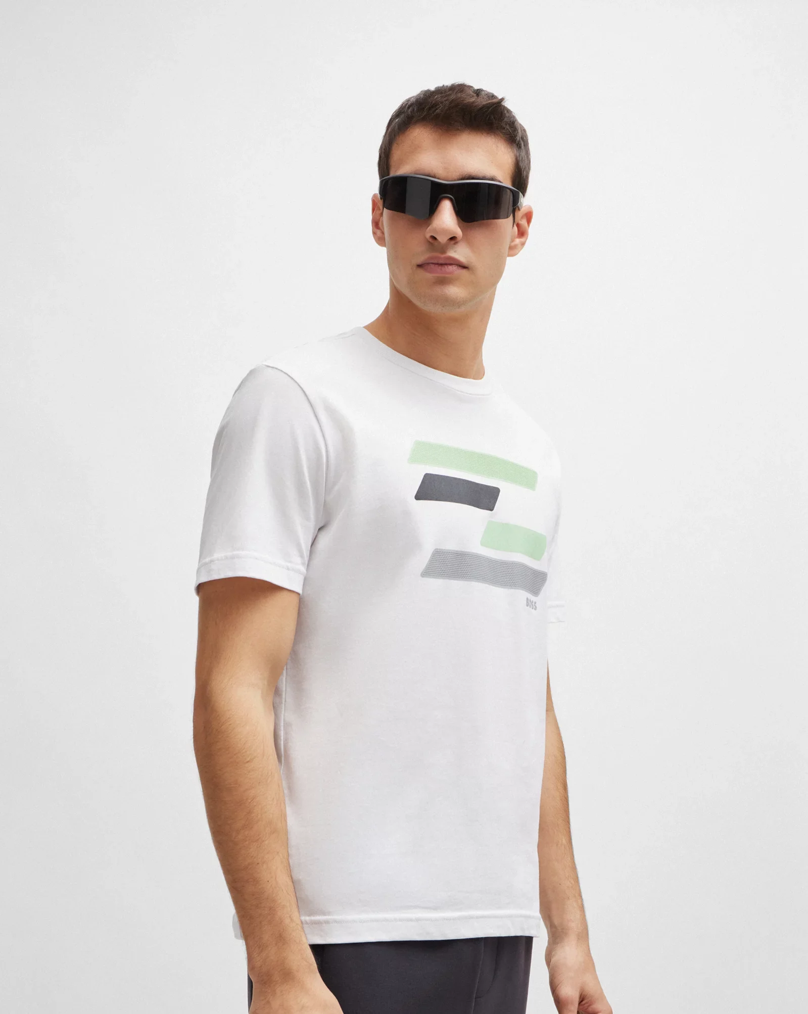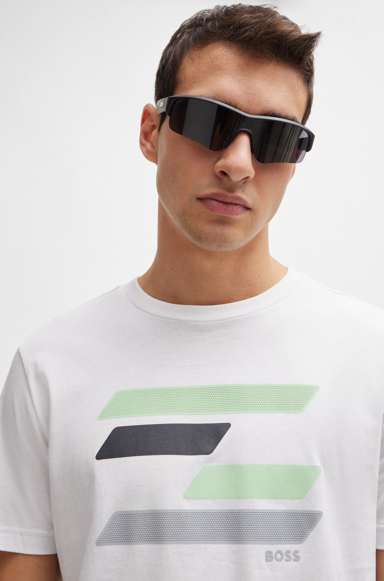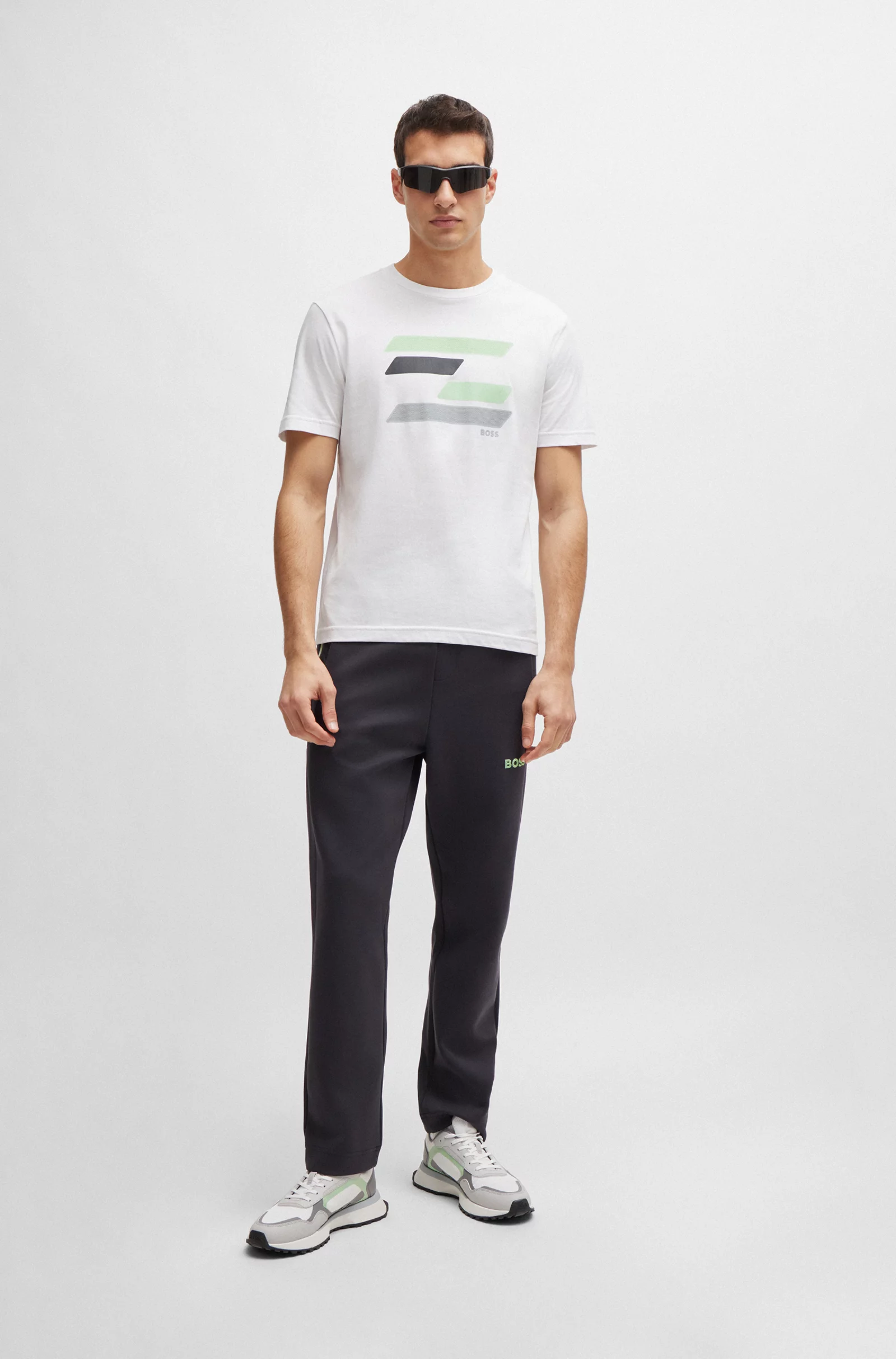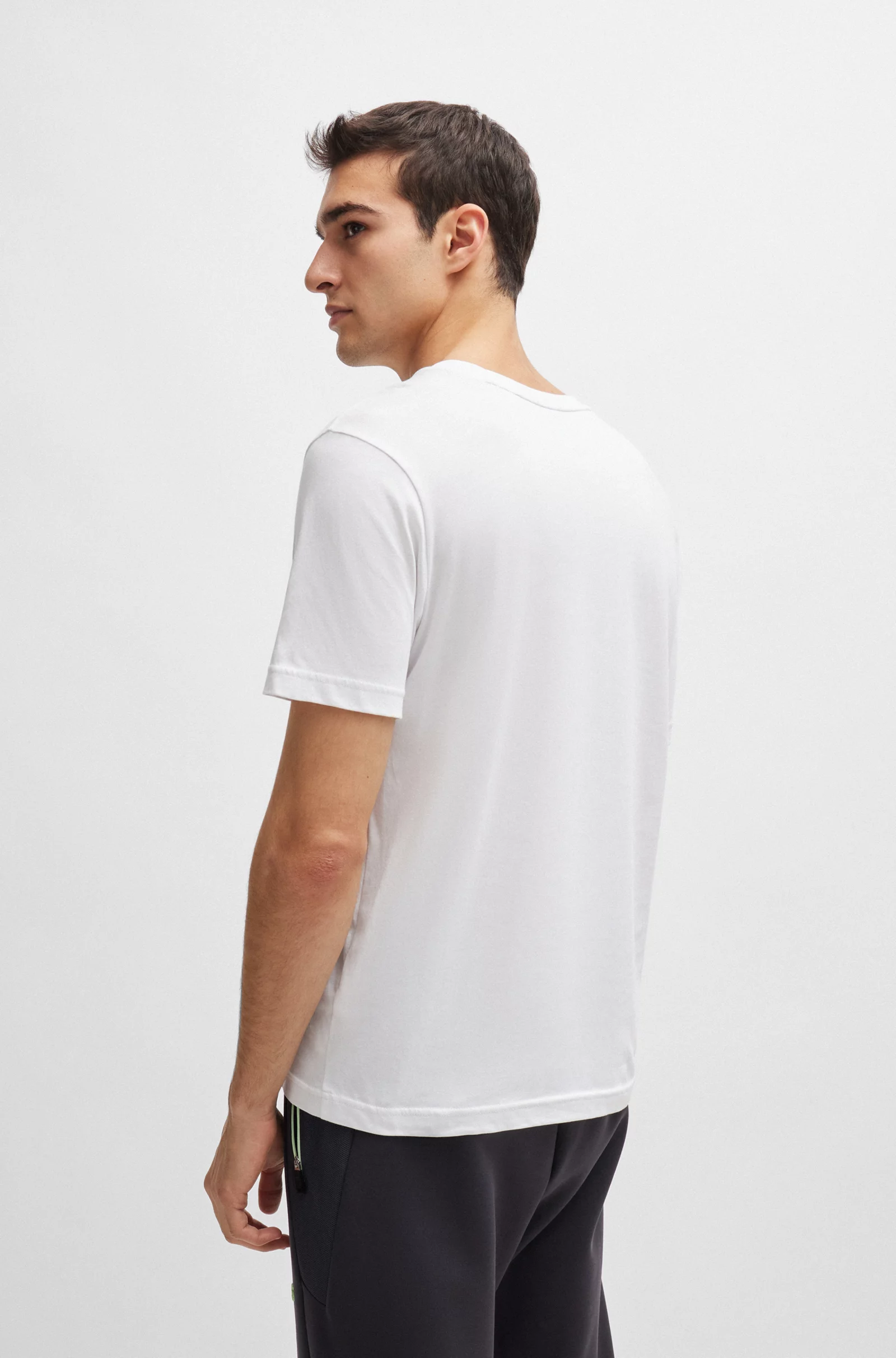 Una camiseta BOSS Hombre regular fit de estilo dinámico, diseñada en punto sencillo con un detalle de la marca y una ilustración inspirada en una bandera en el pecho.