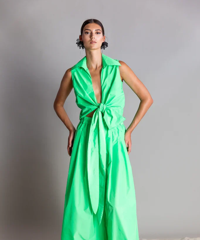 Este impresionante crop top sin mangas está confeccionado en tafetán y presenta un elegante diseño envolvente que se ata y ajusta con una hermosa lazada.