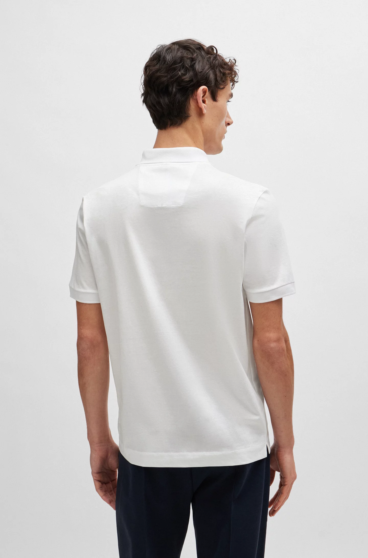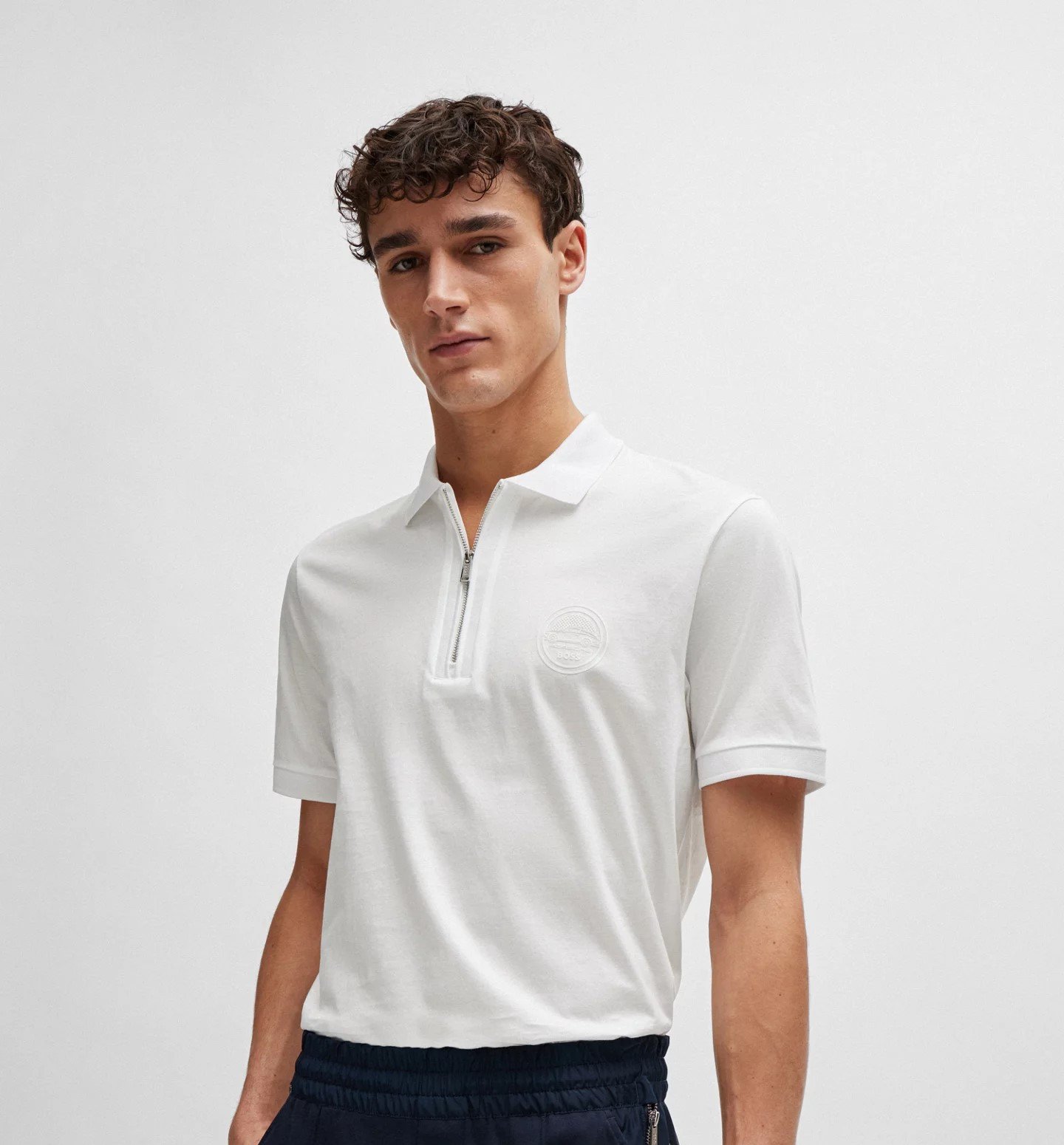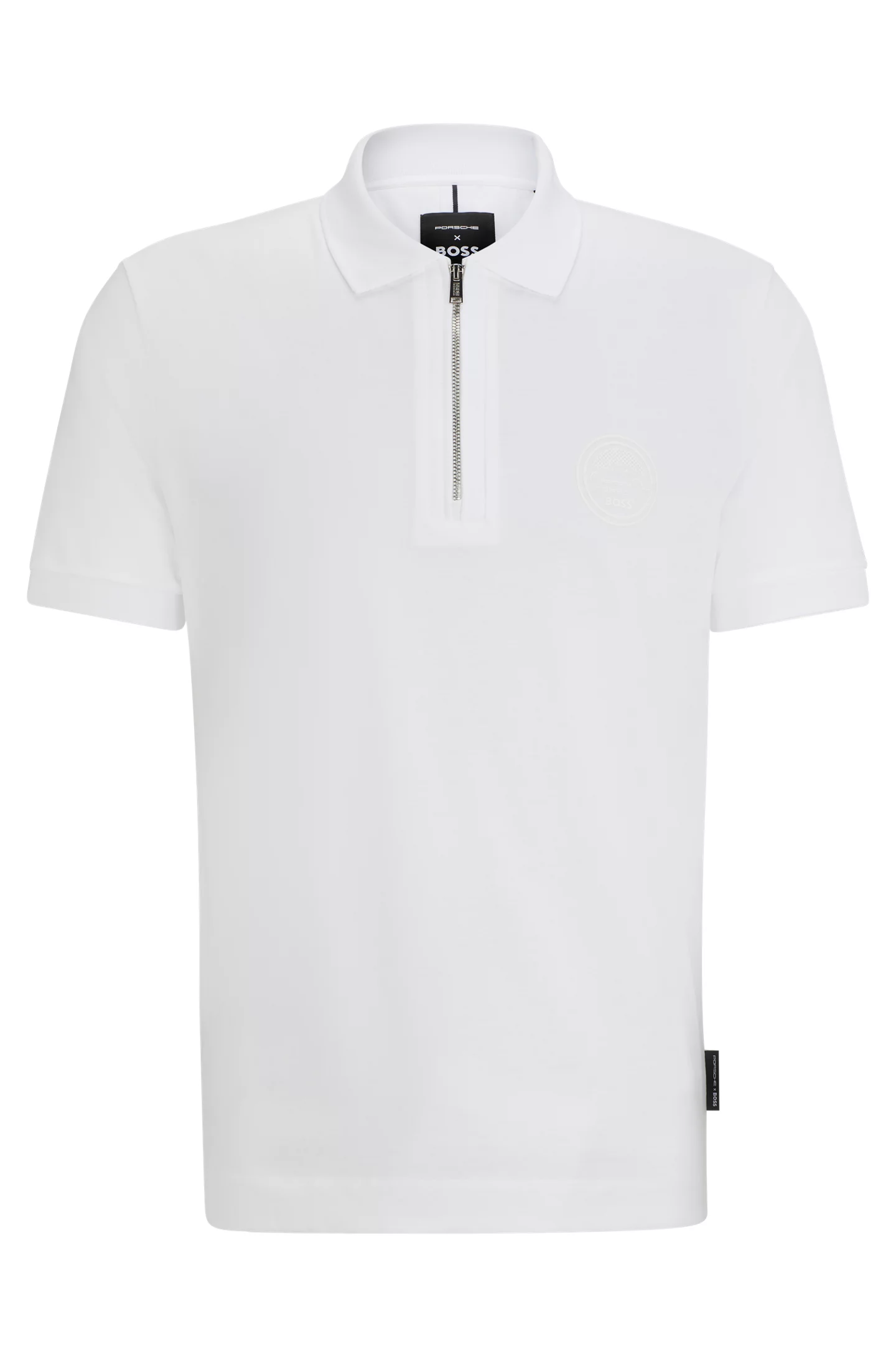 Un característico polo BOSS Hombre. Este polo de manga corta presenta un logo especial estampado en HD en el pecho, un ajuste recto y una cremallera pulida en la tapeta. El tejido de punto sencillo está hecho de algodón mercerizado que aporta gran suavidad. Esta prenda forma parte de la cápsula Porsche x BOSS, una colección de modelos atrevidos que reflejan el espíritu de motivación y determinación que caracteriza a la marca BOSS.