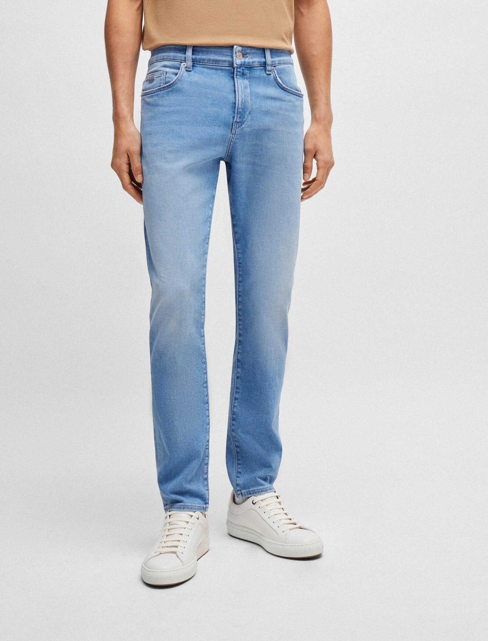 VAQUEROS SLIM FIT EN TEJIDO VAQUERO ELÁSTICO AZUL SUAVE. Unos vaqueros BOSS Hombre supersuaves de tiro medio y ajuste definido en tejido vaquero elástico azul claro.