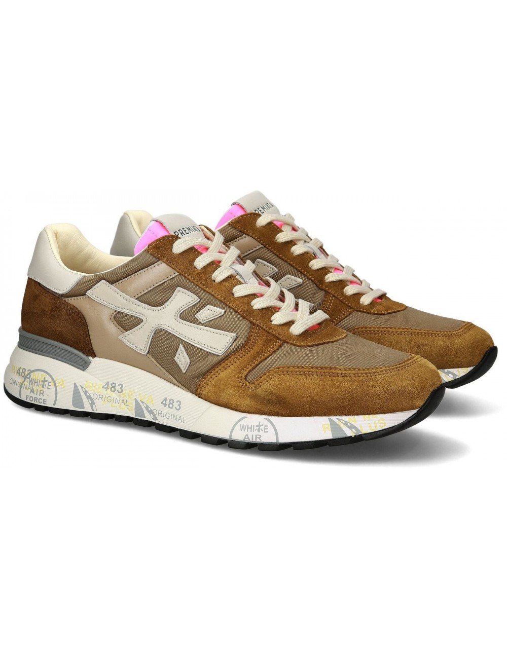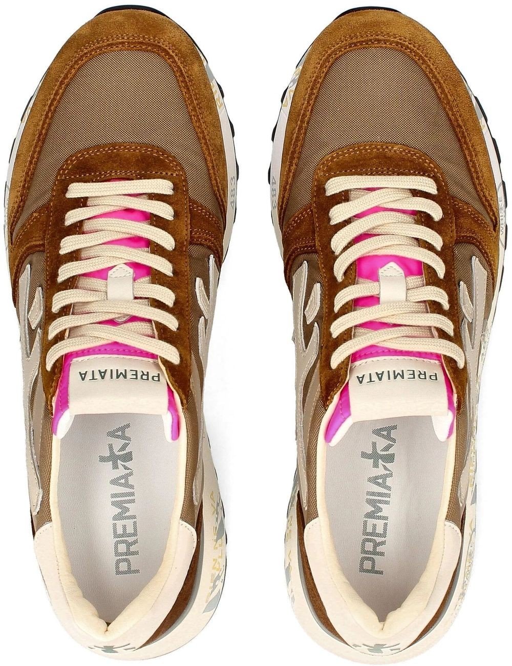 Diseñadas y fabricadas con una mezcla de materiales premium  en nailon y piel, las zapatillas Mick presentan un tono marrón con detalles fucsia en la lengüeta, para un estilo casual y divertido. La silueta icónica se enriquece con el logo de Premiata , dando al diseño un toque distintivo y moderno. Estas zapatillas ofrecen una combinación de comodidad y estilo, lo que las hace adecuadas para muchas ocasiones informales. La atención al detalle y la combinación de colores los convierten en una opción de moda para cualquiera que busque un look dinámico y moderno.